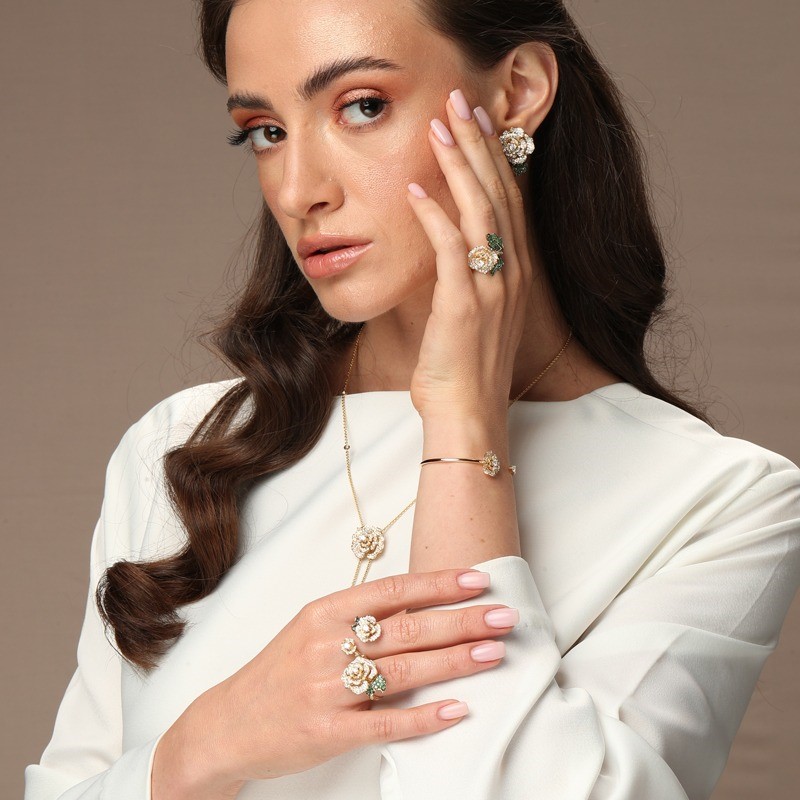 This collection is inspired by the blooming rose, delicately unfurls its internally gold and diamonds paved petals creating the illusion of a real flower. we designed it to suit all ages and occasions in different sizes and different ways to wear it.